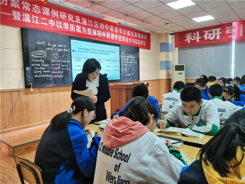 在本次教研活动中,我校杨君华老师在第一节课中向老师们展示了一堂基于我组校本研修课题——《以学历案为载体的初中英语听说课设计和实施策略研究》的学历案常态课。杨老师结合我校近几年听说课研究模式要求,注重学生听说策略培养和听说实效性评价,给听课的专家和同行留下了深刻印象。