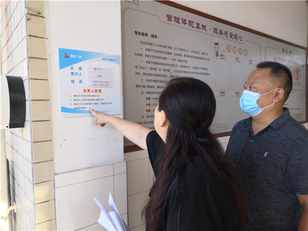 袁淑英督学通过查阅来访登记、安全制度、安全培训记录,查看设施设备及消防安全、住校部安全管理等方式对校内环境、食堂、宿舍、安全等方面进行了督查,并就督查情况与学校交换了意见。