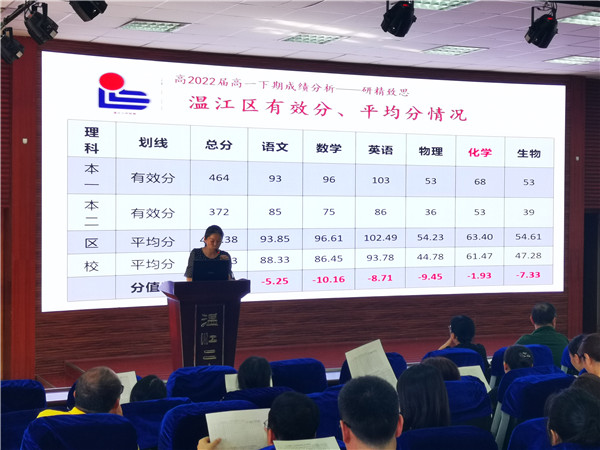 2020年9月7日下午,温江二中高2019级在学校阶梯教室举行了“守初心,担责任;找差距,抓落实”高一下期全区统考成绩分析会,总结分析了本年级在上个学年度教学工作中的成绩,并针对统考成绩数据,查找问题,找到症结,思考出路,制定策略。