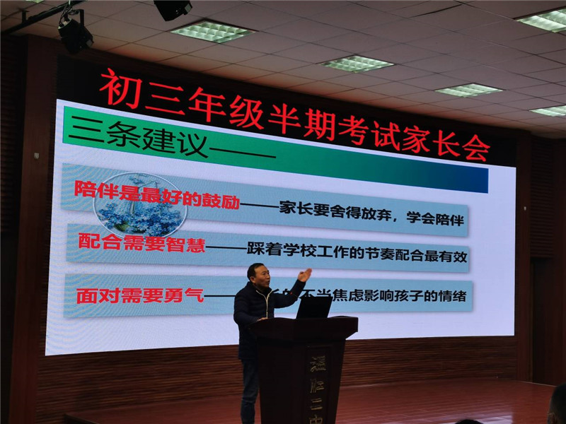 接着,李主任总结了本次半期的考试情况,希望各位家长能够合理看待本次的考试。同时李主任还和家长们分享了我校去年中考、高考实现“低入高出”、“中入优出”的教育佳绩。回顾了初三年级地理生物会考取得的骄人成绩,指出初三年级的学生已经打好的中考的第一仗,希望通过家校配合能够完胜中考,取得令学生和家长满意的成绩。冬季来临,李主任指出身体是革命的本钱,劳逸结合是必要的,希望同学们在搞好学习的同时能合理运用时间锻炼身体。同时提醒家长关注交通、食品卫生等方面的安全问题。