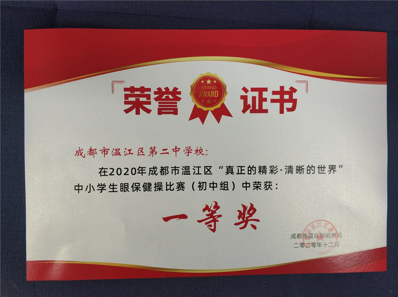 眼睛是孩子心灵的窗户,为了保护学生视力,预防近视,提高学生用眼卫生的意识,同时也为了提高眼保健操的质量,我校积极参加成都市“真正的精彩·清晰的世界”新版眼保健操比赛,并斩获温江区初中组一等奖、温江区高中组一等奖。