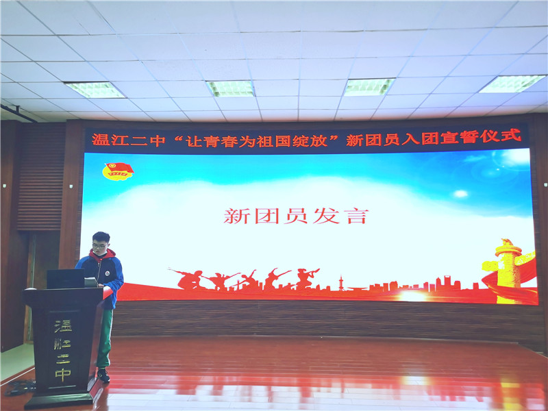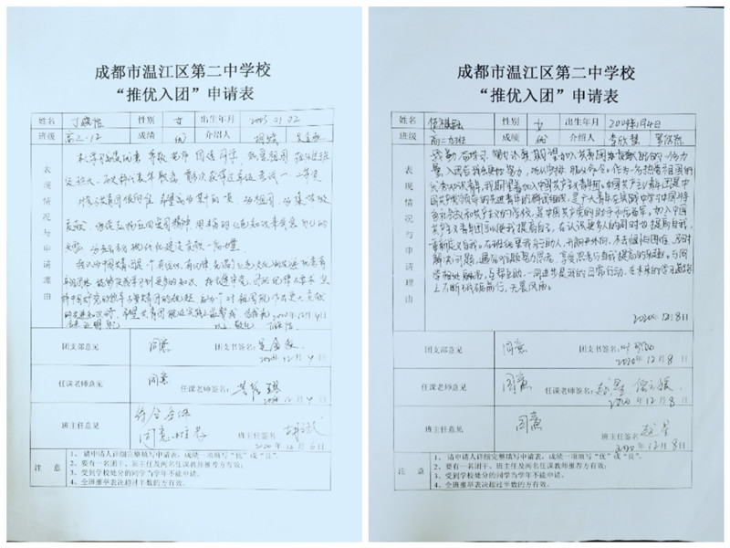 秉持着认真严肃、追求卓越的原则,温江二中入团一直采取的都是“四推一定”程序:主动申请;班主任及科任老师推荐;业余团校培训;团支部讨论;最后确定的入团积极分子填写入团志愿书。最后参加一次庄严的入团仪式。