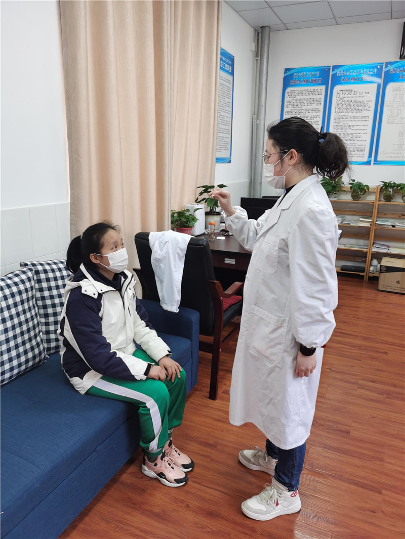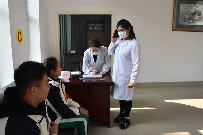 (在隔离观察室校医对学生进行复测体温,并详细询问学生身体状况、前14天内的活动行程以及接触人员等情况,)