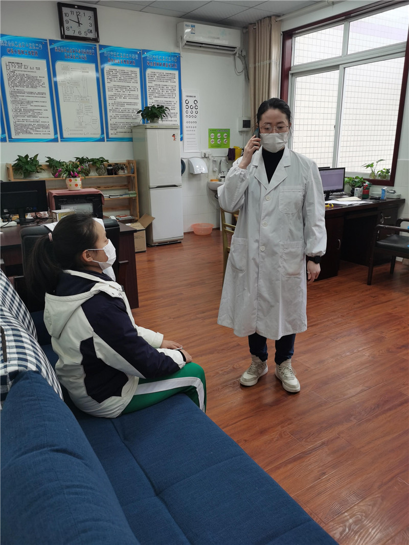 (学生水银温度计复测体温仍然异常,并伴有咳嗽、乏力和精神不振等症状,亟待进一步排查。校医及时报告郭校长,郭校长立即下达处置指令,做好消毒工作与学生就诊工作)