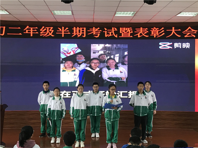 大会第三项是各项活动代表发言。由8位学生代表对开学以来初二年级所参与过的各项活动做了总结,从法制讲座到定向越野活动,从书香研学到排球活动,从才艺展示到篮球活动。初二年级的同学们在各项活动中尽展二中学子风采,在德智体全面发展的道路上一路凯歌、继续前进。