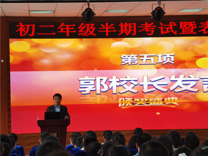 大会第五项是郭校长发表讲话。郭校长肯定了半期考试取得的成绩和进步,高度赞扬了半期以来在常规、学习和各项活动中表现突出的班级和同学们,强调重过程、强落实;重活动、多参与。激励同学们要努力学习,坚持不懈!