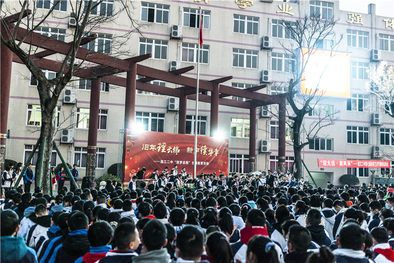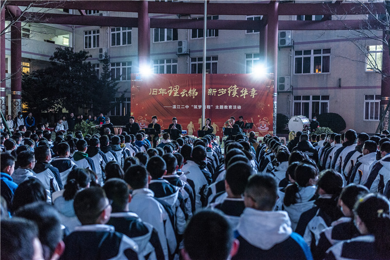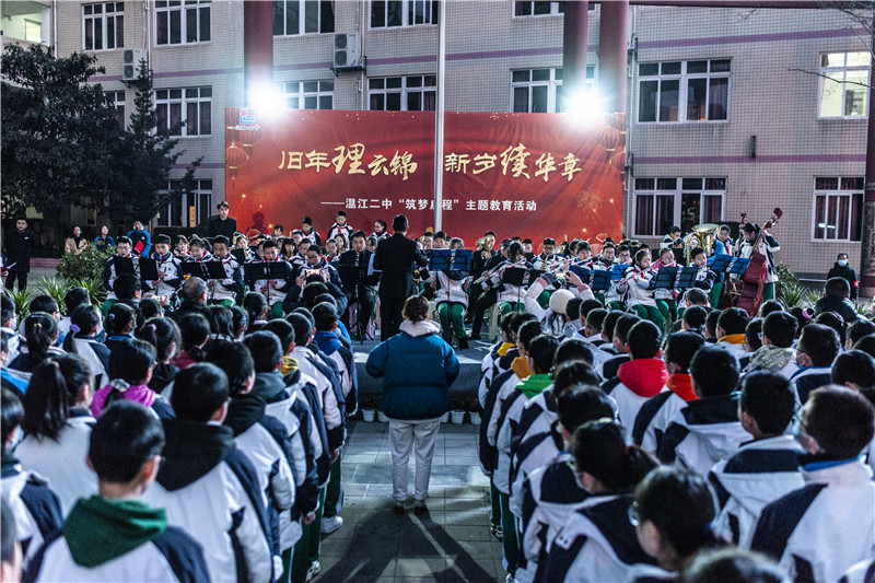 温江二中校长季玲发表了新年致辞。她带领全校师生回顾过去,在历经风雨的2020年,温江二中人初心不忘,以质量求生存,以特色谋发展;我们坚持全面育人,扎实推进“五育并举”,以精细化管理提升教学质量,以校本研修促进教师专业发展,以主题教育促进学生健康成长。我们扎实推进课堂教学改革,努力让课堂焕发生命活力、让班级洋溢成长气息、让校园成为精神家园,让学生成为学习的主人。同时,她寄语全校师生,2021是中国共产党百年华诞。百年征程、百年初心,百年风雨、砥砺前行。对二中人来说,这正是朝着梦想脚踏实地去奋斗、去拼搏、去收获的好时节。让我们开好头、起好步,同心同行,在百舸争流中永葆成长的动力,在沧海横流中坚守教育的初心,在时光荏苒中遇见更好的自己。