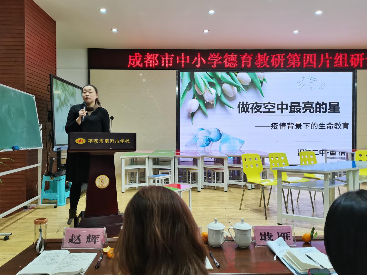 本次成都市德育教研研讨活动主题为“后疫情背景下的德育主题教育实践探索”。活动中,我校高三、3班班主任董蓓老师以“做夜空中最亮的星——疫情下的生命教育”为主题进行了微讲座。董老师的微讲座主要从六个方面展开:敬畏自然,遵循规律;善待生命、恪守规则;守护生命、执念感恩;热爱生命、习惯养成;尊重生命、诚信立身;珍爱生命、恪尽责任。