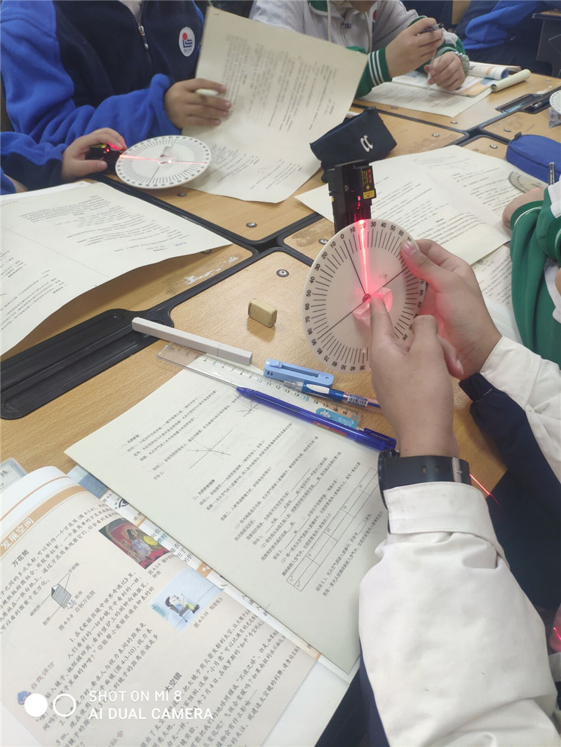 学校领导对此次活动非常重视,在周一上午第三节课,和物理教研组的老师们,来到了综合楼418未来教室,一起参与了听课活动。课堂主题为夏铭悦老师在初二(1)班讲授八年级上物理第四章第四节《光的折射》。夏老师利用了学历案,细化任务和归纳知识,更利于学生对新课的接收;并准备了丰富的分组实验内容,以学生根据之前学习的光的反射规律,主动探究光的折射规律为主,提升了学生的学习兴趣,加强了对知识点的理解。整节课气氛轻松,环节紧凑,学生在探究合作中逐渐掌握知识,跟着学习任务一起进行实践讨论。最终达到课标要求,养成了学生对于事物深度探索的物理核心素养。各位老师在课后继续聚焦问题,在初中理化办公室对课堂的教学准备、教学设计、教学思路等做了分析和讨论,从课堂活动和学生学习的角度进行思考,提出了非常有效和深入的建议。