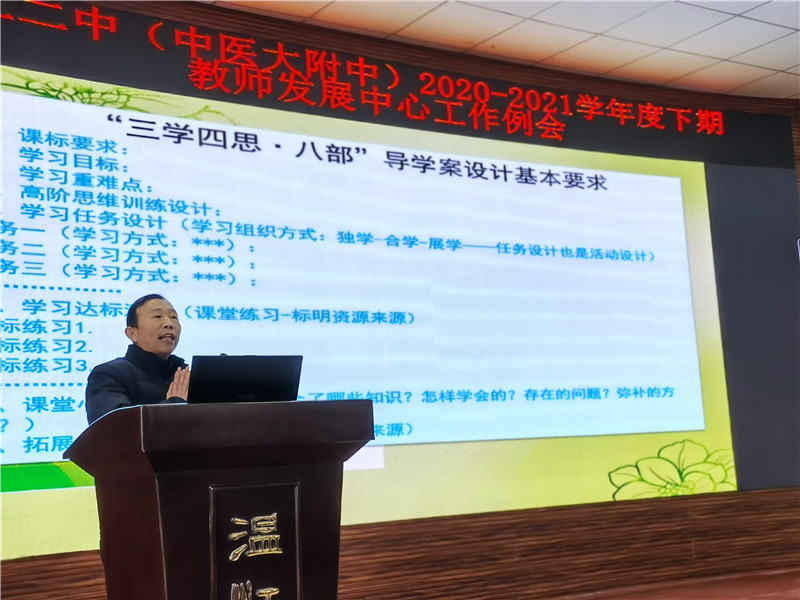 教育研究中心主任唐应树以《探索技术路径,规范备课行为,深度推进课改》为题作了专题讲座。唐主任对我校“学本课堂教学模式”进行细致解读,并对本期教育研究中心的工作进行部署。本学期我校将以“三学四思·八部”导学案的设计为备课规范,“三学”即独学、合学和群学,“四思”即在课后小结、学习反思环节学生要作如下思考:学会了哪些知识?怎样学会的?存在的问题?弥补的方法?“八部”即导学案构成的八个部分。新学期,新气象,希望老师们可以以导学案的设计备课为突破口助力课堂改革和教学水平提升。