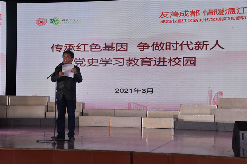 演出前,温江二中副校长郭久清代表学校对区委宣传部、区精神文明办、区光祈艺术团表示了热烈的欢迎和诚挚的感谢。他指出此次红色经典演出对我们的同学们来说是最好的营养剂,重温红色文化,让大家得到情感上的滋养、思想上的启迪、道德上的教育和价值上的引领 ,更加坚定理想信念,更加强化忠诚担当。