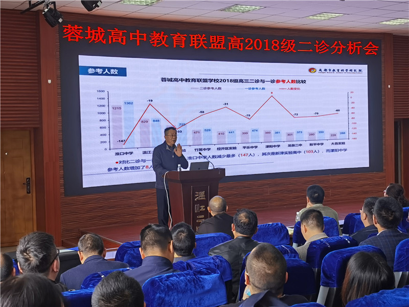 成都市高2018级学生的二诊考试已经落下帷幕,为更好地对成都市二诊考试数据进行深入分析,帮助蓉城高中联盟各学校的高三教师把握后期复习方向,提升复习效益,温江二中、经开区实验中学、平乐中学、淮口中学、濛阳中学、大邑实验中学、敖平中学、竹篙中学、新津实验中学、龙泉二中等蓉城高中联盟成员学校的各级领导、教师代表50余人于2021年4月7日下午齐聚温江二中阶梯教室就本次成都市二诊数据进行分析研讨。温江二中校长季玲、副校长袁成、校长助理熊书钢、学校各发展中心负责人,及全体教研组长、备课组长、年级组长、高三教师等参加了本次研讨会。本次研讨会特邀成都市教育科学研究院钟南书记为联盟各学校作二诊数据专题分析报告。