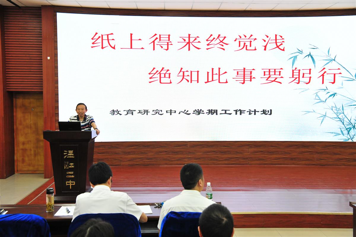 教育研究中心主任唐应树以《纸上得来终觉浅,绝知此事要躬行》为题,提出了学年度教育研究四大目标:一是完善学本课堂操作路径,将“学本课堂”理念与“三学四思·八部”有机结合,组织好集体备课,优化教学设计,提高课堂教学效益;二是围绕学本课堂龙头课题推进校本子课题研究,创新校本教研模式;三是深化“学本课堂”理论成果提炼;四是促进青年教师专业发展,产生一批骨干和名优教师。唐主任提出四大工作举措:一是加强校本研修制度建设;二是聚焦课堂教学,让“学本课堂”理念在课堂落地;三是加强作业研究,减负增效;四是深入研究,升华理论认识,物化认识成果。