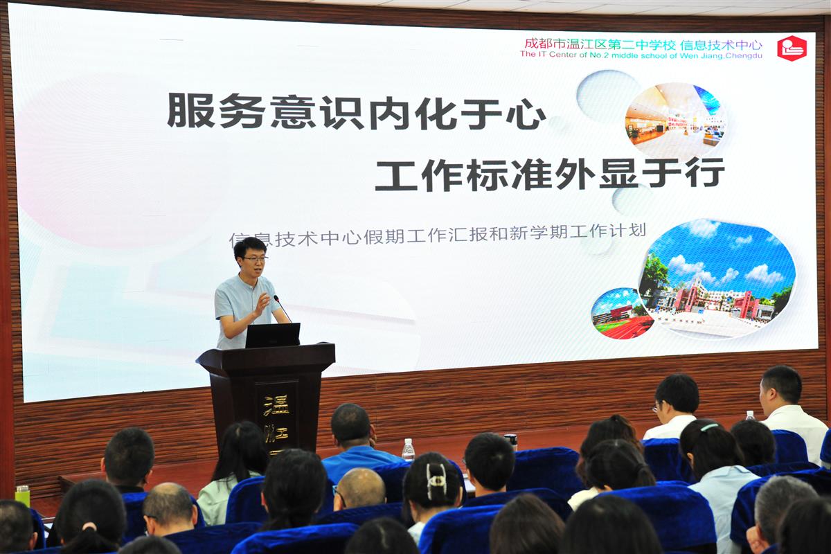 信息技术中心副主任白冰汇报了暑假里功能室的迁装、实验室的改造、一体机的安装、信息技术装备升级、教材发放准备等;白主任表示,新学期图书馆将正式向师生开放,班牌功能将得到扩展,进一步提升服务师生的质量。