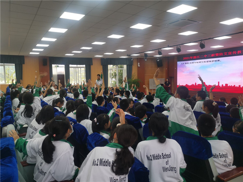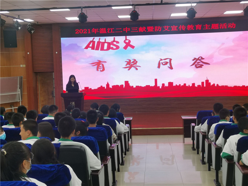 本次讲座由我校学生发展中心王强主任主持。首先,来自区疾控中心的陈玉莲老师通过生动形象的语言,向同学们介绍了什么是“三献”(即无偿献血、造血干细胞捐献和公民逝世后人体器官捐献),我们为什么要“三献”,“三献”对我们个人和社会有什么积极意义等相关知识。陈老师鼓励同学们从小培养社会责任感,长大后要成为一个有社会担当、有爱心的人。接着,陈老师又结合目前我区艾滋病防控现状,以及近年来艾滋病从高危人群向一般人群蔓延的严峻形势,用真实的案例,详实的数据深入浅出地介绍了艾滋病的致病原理、诊断方式、传播途径以及防治措施。希望同学们增强自我保护意识,洁身自好。随后,陈老师一行还组织全体参会同学开展了艾滋病知识有奖竞答。