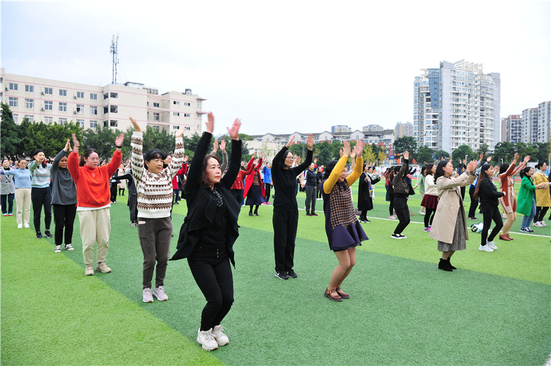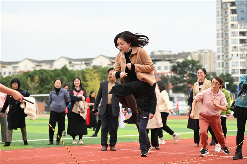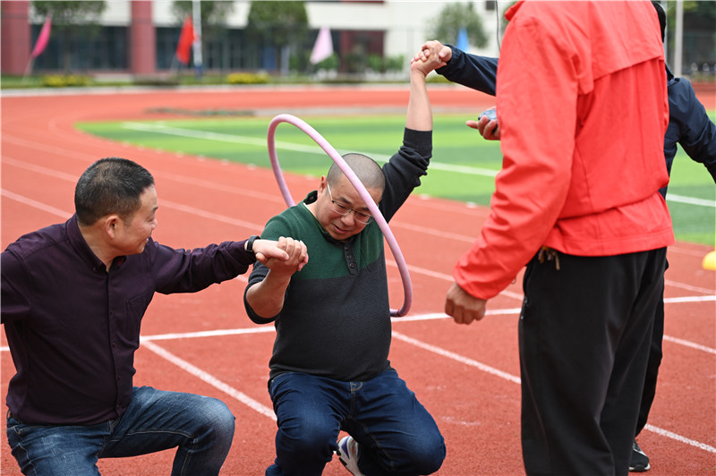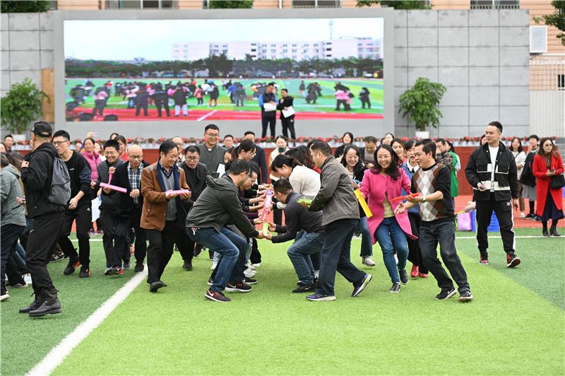 为庆祝建党100周年华诞,丰富全校教职工课余文化生活,倡导“每天健身一小时,健康生活一辈子”的理念,全面推进学校健身运动的深入开展,增强教师身体素质和集体凝聚力,构建“和谐校园”,温江二中于2021年10月26日下午4时,在学校田径运动场举行了一场以“团结协作,共享快乐”为主题的教职工趣味运动会。