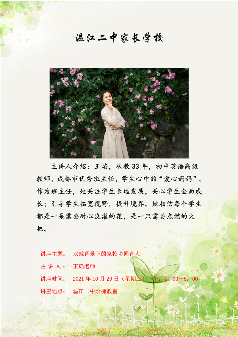 1020日下午四点,家长学校开始了新学期的课程。本次讲座的主讲人为成都市优秀班主任、温江二中英语高级教师王焰。本场讲座主要面向初一、初二年级家长,280名家长踊跃报名参加了本次活动
