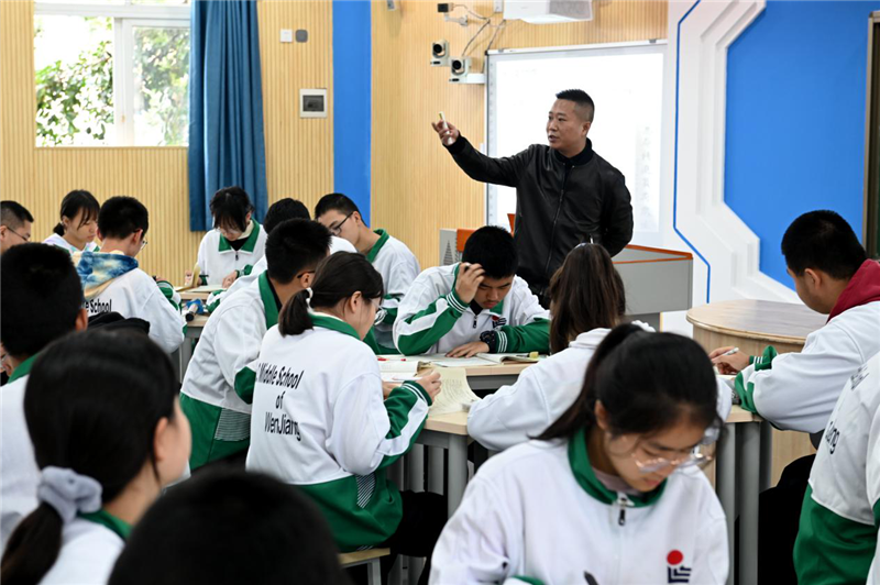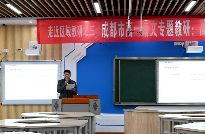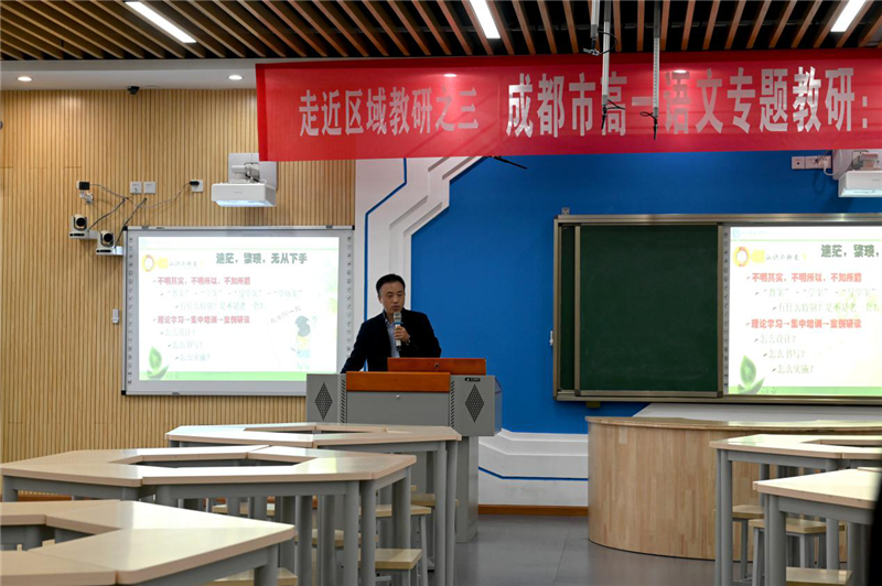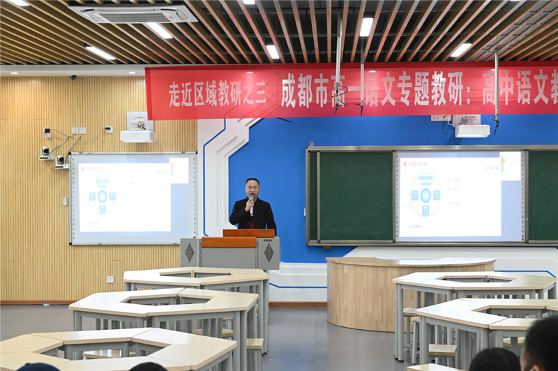 从学校教研层面出发,王贤康老师带来题为“用‘理念’引领‘历练’,让‘教堂’变为‘学堂’的发言。王老师介绍,在“教学评一致性”理念的引领下,温江中学语文教研组积极开展理论学习、集中培训、案例研读等教研活动,促进学科教师能从在认识上形成从以教为中心到以学为中心的立场转变、由讲授者到参与者的角色转变、 由经验教学到专业教学的专业转变,力求从教学设计、课堂实施、教研引领三个方面回到语文的本真,落实对语文学科核心素养的培养。