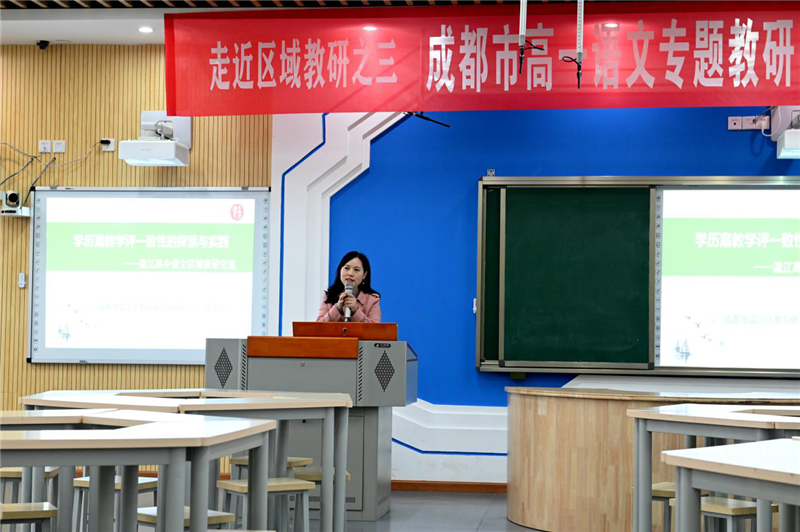 教研活动第二环节,分别由温江区高中语文教研员冯海霞、四川省温江中学高中语文教研组长王贤康和温江区成都七中实验学校高一语文备课组长任重衡三位老师带来高中语文“教—学—评”一致性研究经验分享微讲座。