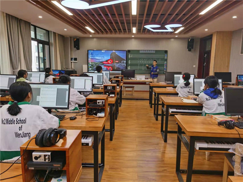 办什么样的教育,就要开发什么样的课程。温江二中办学理念是“让每一个学生都得到发展”,就是要给学生提供丰富多彩的课程,提供可供个性化发展选择的课程。从学校实际出发,充分发挥教师资源和专业优势,本着学生自主选课的原则,学校特色发展中心为高一年级开设了播音主持、校园电视节目制作、国际理解、武术、操舞、毽球、现代中国画、摄影绘、电脑音乐制作等26门校本特色选修课,为高二年级开设了影视表演、现代装饰国画、象棋、创意剪纸、篮球、阅读技巧与文献检索等11门校本特色选修课。(图:部分课程上课图)