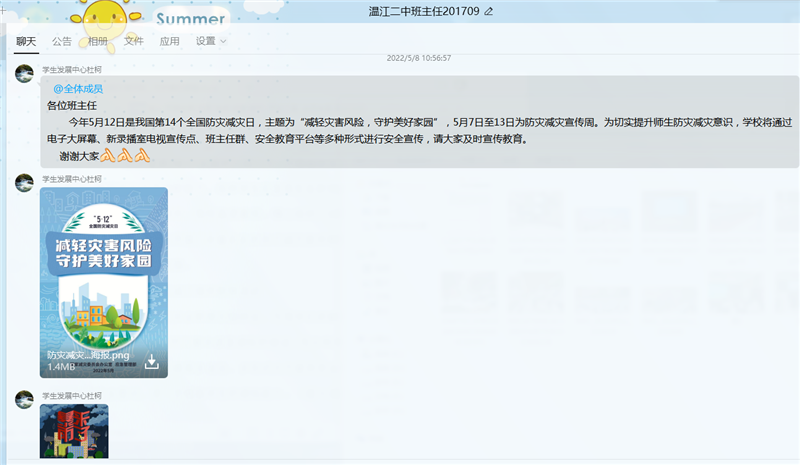 各班通过主题班会开展了防灾减灾安全教育,班主任为同学们讲解防火、防震等安全知识;示范了在自然灾害中紧急避险的正确做法。学校利用班主任群、家长群以及校内电子显示屏等多途径、多形式宣传安全应急知识,强化学生安全意识,进一步提高学生的避险能力。、
