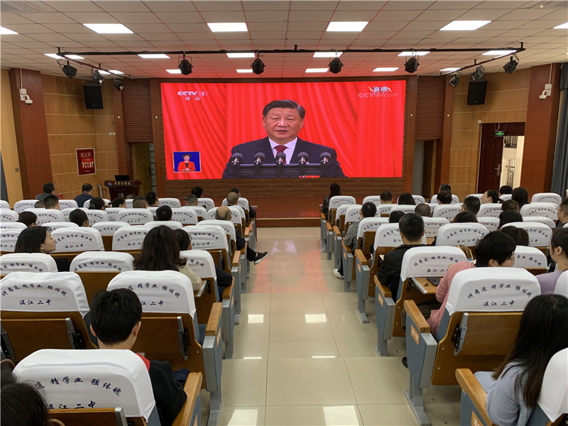20221016日上午,温江二中组织全体行政干部和部分党员教师在学校阶梯教室集中收看了中国共产党第二十次全国代表大会。同时,其他党员和教职工居家收看大会盛况。