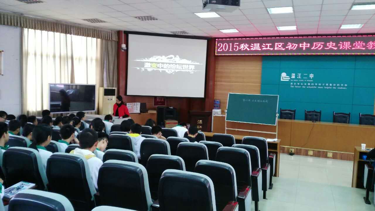 2015年11月5日上午温江二中初中历史备课组承办了温江区初中历史课堂大赛,初三年级的4、5、6、7班与参赛教师一起为全区教师奉献了四节优质历史课堂。在阶梯教室胥小龙、余欢、杨勇、高久红四位青年教师为全区教师上了同一课《日本明治维新》。虽然是同一课内容,但各有各的精彩,都体现了以教师为主导,学生为主体思想,内容科学合理,形式新颖,启发探究式教法应用得当,体现创新意识;同时学生活动、思维训练设计合理,教与学、讲与练协调一致,能引导学生积极参与教学活动。