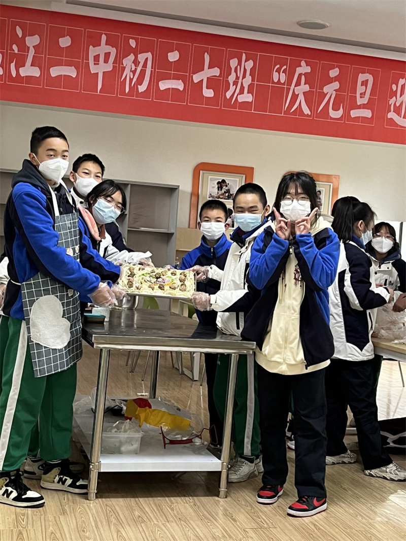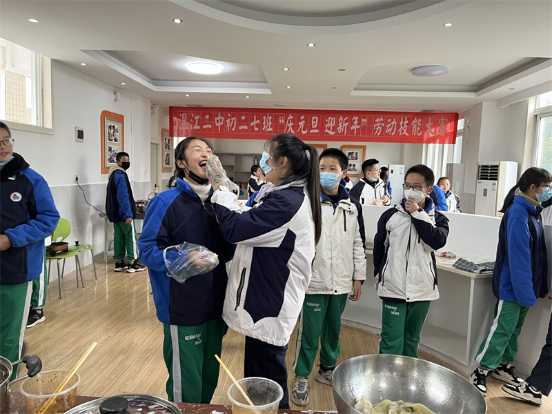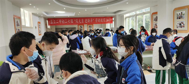 为丰富学生的校园文化生活,让同学们感受到冬季的温暖,营造和谐温馨的校园氛围,12月28日上午,初二7班班主任罗兰老师带领全班同学在我校烘焙室进行了主题为“庆元旦 迎新年”的包饺子劳动技能大赛。本次活动特别邀请校长季玲和初二7班全体科任老师参加。