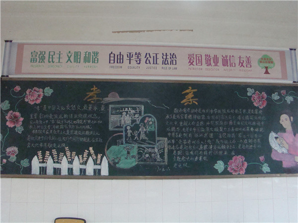 校园文化建设应传承学校特色,校园文化建设应结合学生实际、富有时代特色,温江二中一直坚持“孝亲教育”作为校园文化建设的核心。为配合“孝.亲”主题教育月活动,温江二中德育处把班级黑板报当作向学生进行“孝亲感恩”教育的重要阵地。