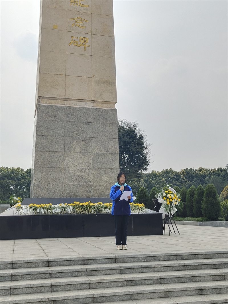 在烈士纪念碑前,高一、7班团支书卢宇晗同学做了“缅怀革命先烈,吾辈定当自强”的演讲,她讲到我们今天的幸福生活是无数革命先烈用青春和热血换来的。我们要刻苦学习,力求有所作为,传承革命精神,树立报国之心,成为有责任感,不负先辈嘱托、无愧祖国和人民关怀的一代青年。