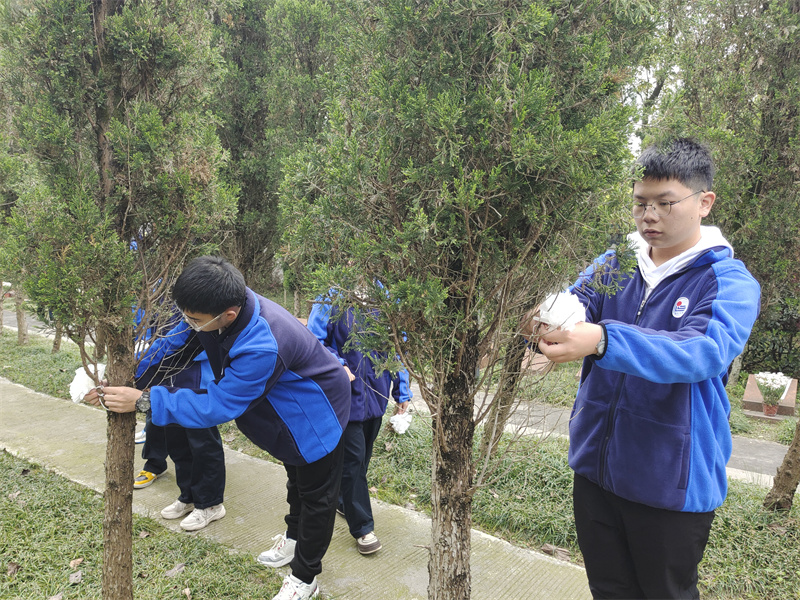 活动最后,同学们纷纷自己亲手制作的小白花系在烈士墓碑后的松柏上表达自己的哀思敬仰之情。整个过程庄严肃穆。