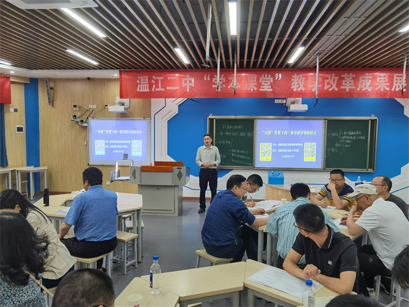 为落实“双新”课堂理念,优化数学课堂教学,提升教学水平,助力我区青年教师专业成长。4月17日下午,“双新”背景下高一数学教学策略研讨活动在我校举行。区数学教研员黄永露、我校副校长袁成,我校高中数学教师以及温江区兄弟学校的教师共同参会。