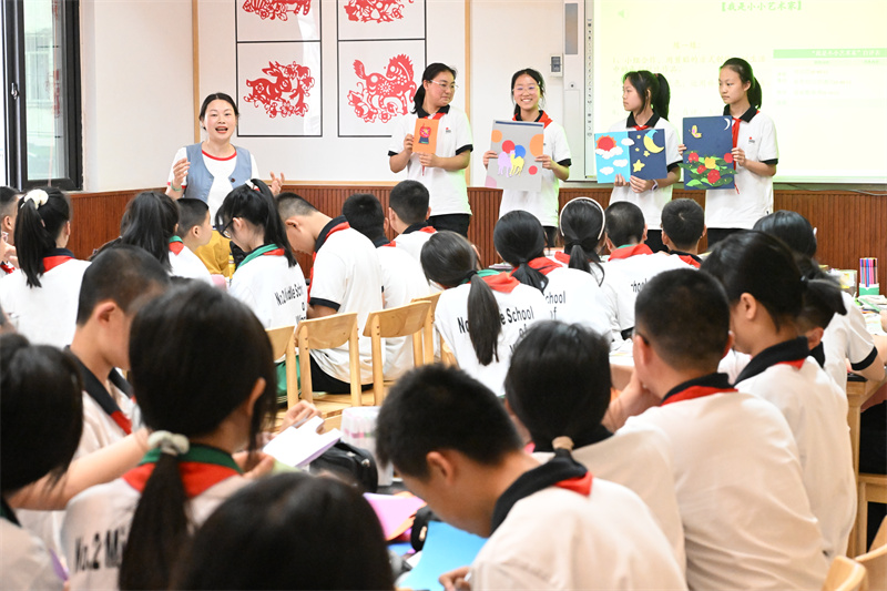 课后,辜老师对两堂课进行了悉心指导。辜老师肯定了两节课是基于大单元设计理念的有效实践,课程设计完整清晰,体现了“学为中心”的学生观,引领学生去感受美、发现美、阐述美,充分发挥了美育功能。同时,辜老师也指出,我们不仅要告诉学生什么是“美”,还应该教会学生如何去发现美和欣赏美,这才是美育的价值所在。