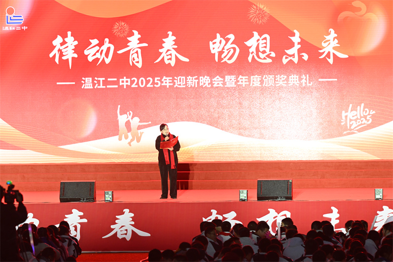 晚会伊始,校党委书记季玲发表了热情洋溢的新年贺辞。季书记向全校师生、家长以及社会各界朋友们致以新年的问候和美好的祝愿,并回顾了2024年学校在高质量党建引领下提升学校办学质量、推动学校品质发展等方面取得的可喜成绩。她提出,希望全体二中人在2025年继续坚守初心、鼓足干劲,以更加坚定的信念、更加饱满的热情、更加务实的作风,为每一名二中学子的美好未来,为温江教育品质发展贡献二中的智慧和力量。