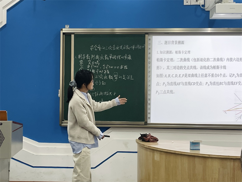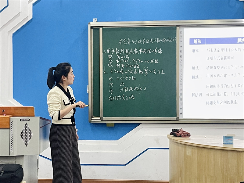 杨珍老师执教《利用导数求含参三次多项式函数的单调区间》展示课,以问题链为框架组织课堂,从导数与函数单调性关系回顾入手,通过对书本例题解题过程的反思,最终达成含参函数单调性探究的思维进阶。课堂贯彻双新理念,系统规范的板书设计与层层递进的教学环节相得益彰,既夯实基础知识又突破重难点,充分展现了杨老师先进的教学理念和精湛的课堂驾驭能力。
